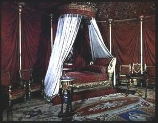 Supporting posts between the draped fabric walls hold up a ceiling of abstract gold loops and spirals, circles and arabesques... above the Empire bed, piled high and luxuriant with claret cushions, is a round canopy and lambrequin, crested with an imperial eagle from days of old... the ghosts of Ney and Marmont gallop through the shadows, and a faint current of gunpowder underlies the perfume of roses...