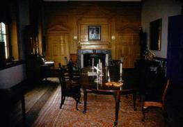 Remember those doors to the right? A firm grasp on either of the lion's head knobs will send the panels sliding back into wall pockets, opening the way into a narrow oblong chamber the exact width of the entry hall... the tile continues as far as the next room, the Robsart Study, where diamond-cut parquetry, polished like gold, takes over...