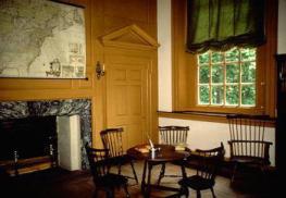 A plain Regency fireplace... restrained mouldings near the ceiling... the picture of simplicity... nestled into the corner, between hearth and window, are a small card table of polished cherry, a side table topped with a brass candlestick, and a pair of plush parlor chairs lined with antique satin, striped rose and eggshell...