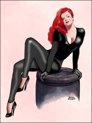 Hourglass curves have always afforded her a fondness for latex catsuits. Most often, she wears black, all the better to embrace the shadows. Sometimes, too, she wears a long black velvet opera coat closed with a single narrow buckle at her waist; the coat reaches nearly to the ground, its hem sweeping backward in a graceful arc when she walks, its wide lapels hugging the curve of her bosom.